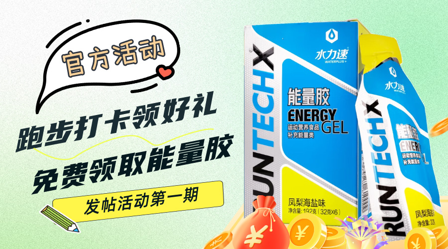 为了鼓励大家坚持跑步,分享跑步的快乐与心得,跑步笔记论坛特别举办 “发帖领奖品” 活动,只要参与,就有机会免费领取一盒水力速能量胶!